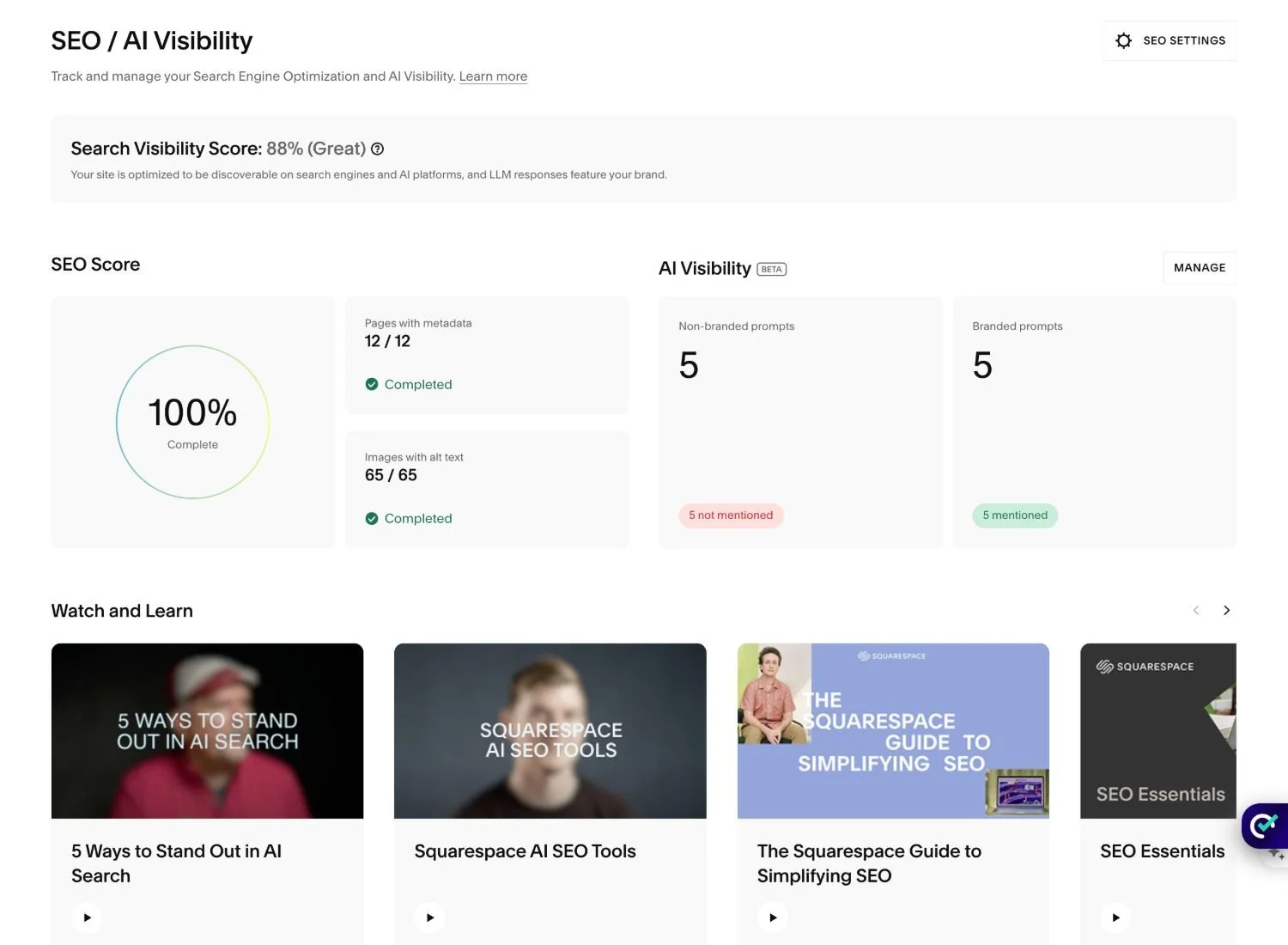 AI visibility: This is the really forward-thinking feature. Squarespace now shows you how visible your site is in AI-generated search results - the kind of answers that appear in ChatGPT, Gemini, and Google's AI Overviews. As more people use AI tools to find businesses and services, showing up in these results is becoming just as important as ranking on Google.