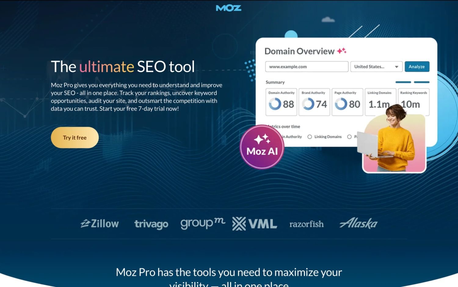 Slightly more beginner-friendly than Semrush or Ahrefs, Moz Pro offers keyword tracking, site audits, and a helpful 'Domain Authority' metric. It's a solid mid-range option.