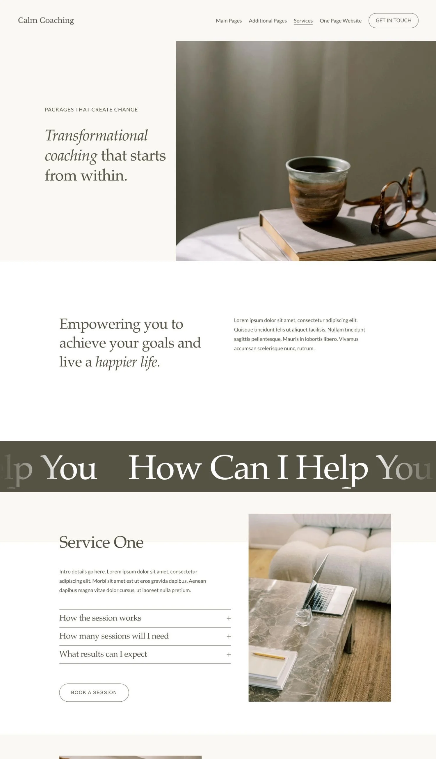 The Ottilie Squarespace template comes with 12* beautiful and strategically designed pages. Click the link to view the live pages.